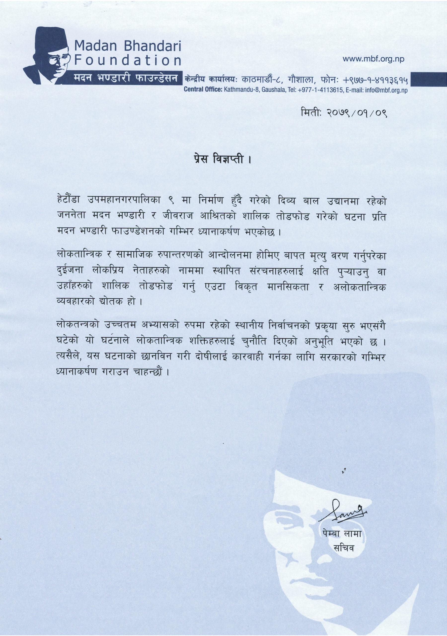 जननेता मदन भण्डारी र कुशल संगठक जीवराज आश्रितको शालिक तोडफोडको घटनाप्रति प्रेस विज्ञप्ती